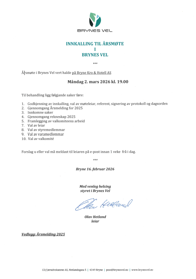 Velkommen til årsmøte i Brynes Vel på Bryne Kro & Hotell mandag 2. mars 2026 kl. 19:00.